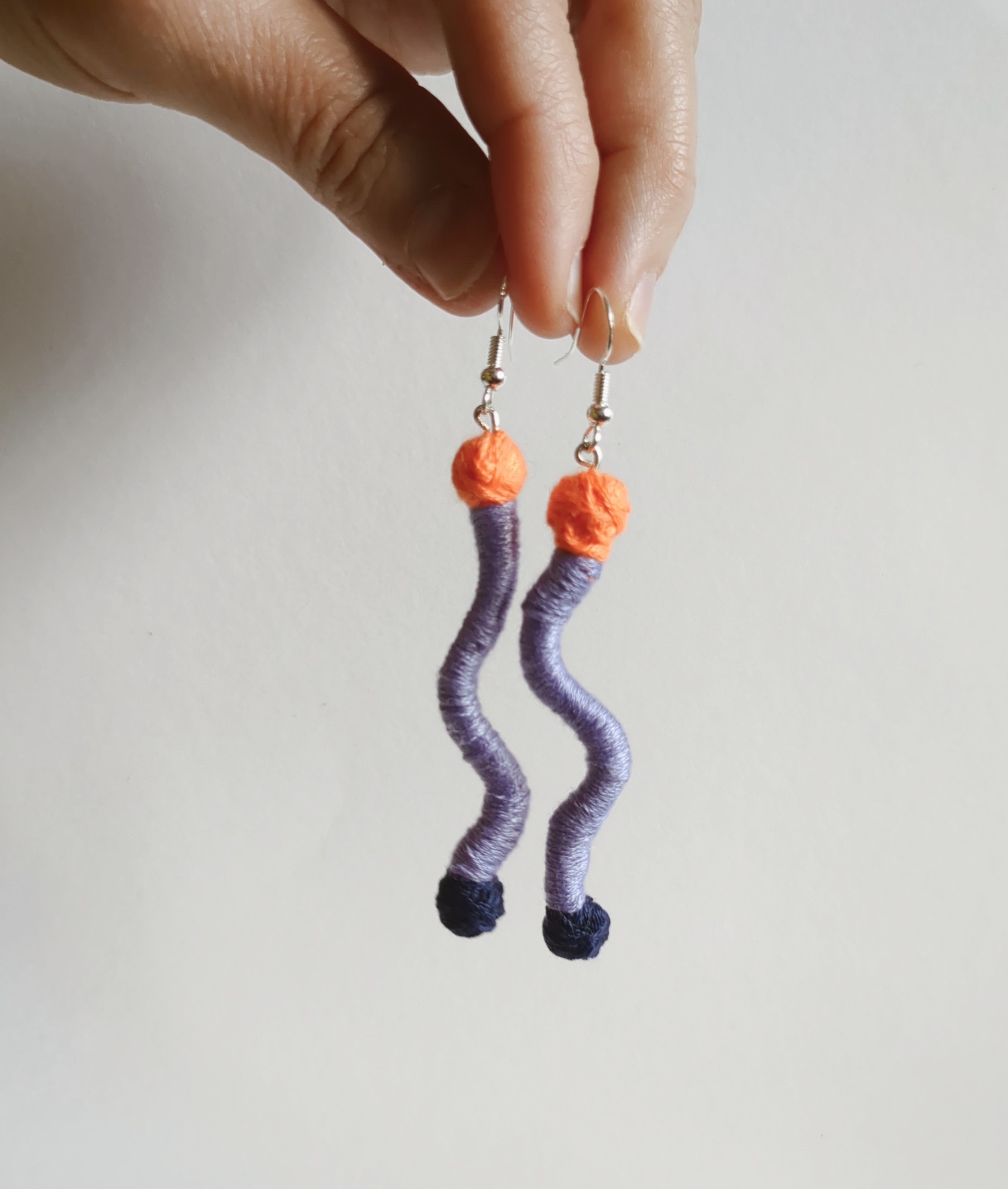 Paire de boucles d’oreilles brodées entièrement à la main, mettant en valeur un délicat travail de fils aux couleurs violet, orange et bleu. Chaque détail est réalisé avec soin, faisant de cette création une pièce unique, à la fois colorée et élégante.