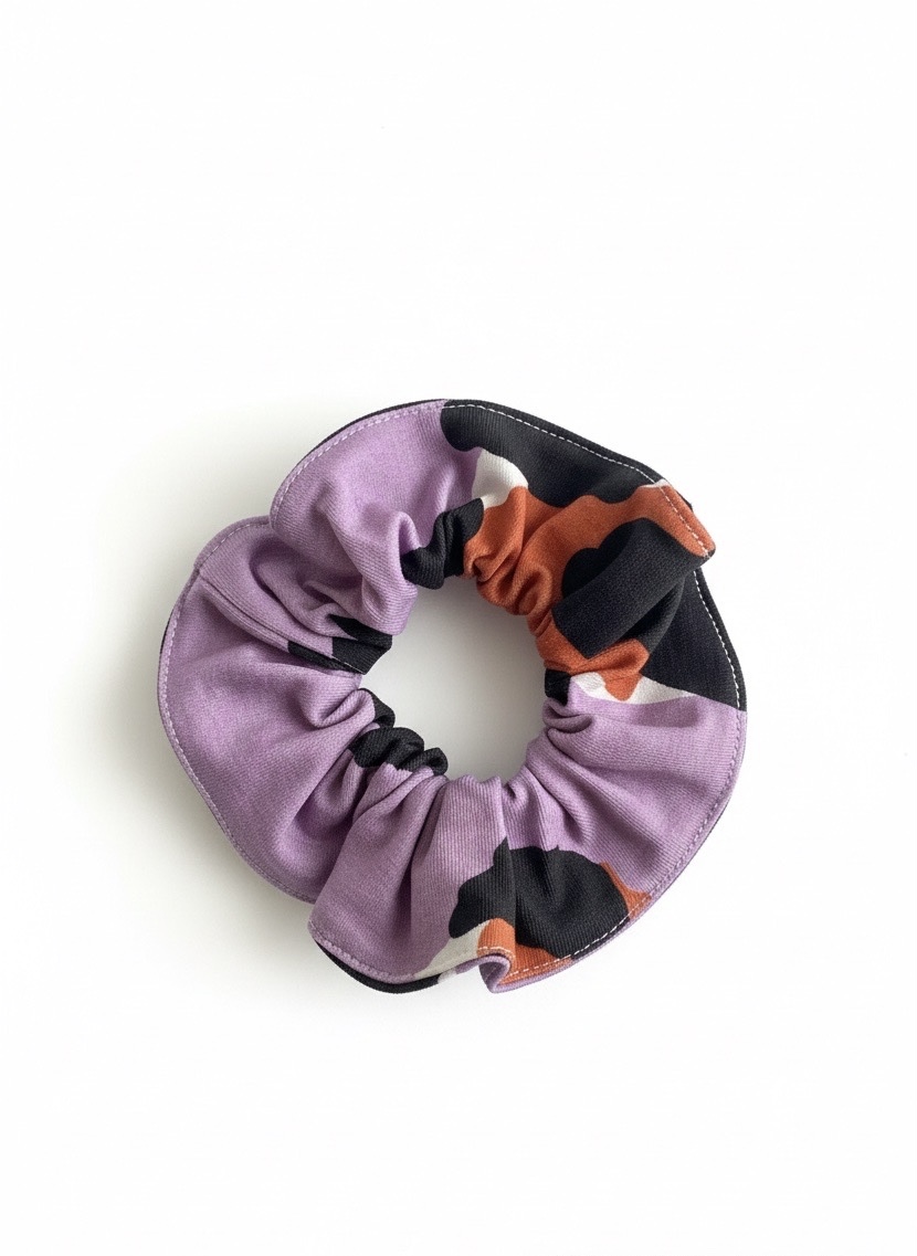 Chouchou fait main en jersey imprimé violet, noir et orange inspiration abstrait , idéal pour faire une jolie queue de cheval, ce chouchou s’adapte à tous types de cheveux et de coiffures. pièce unique, lavable en machine à 30°