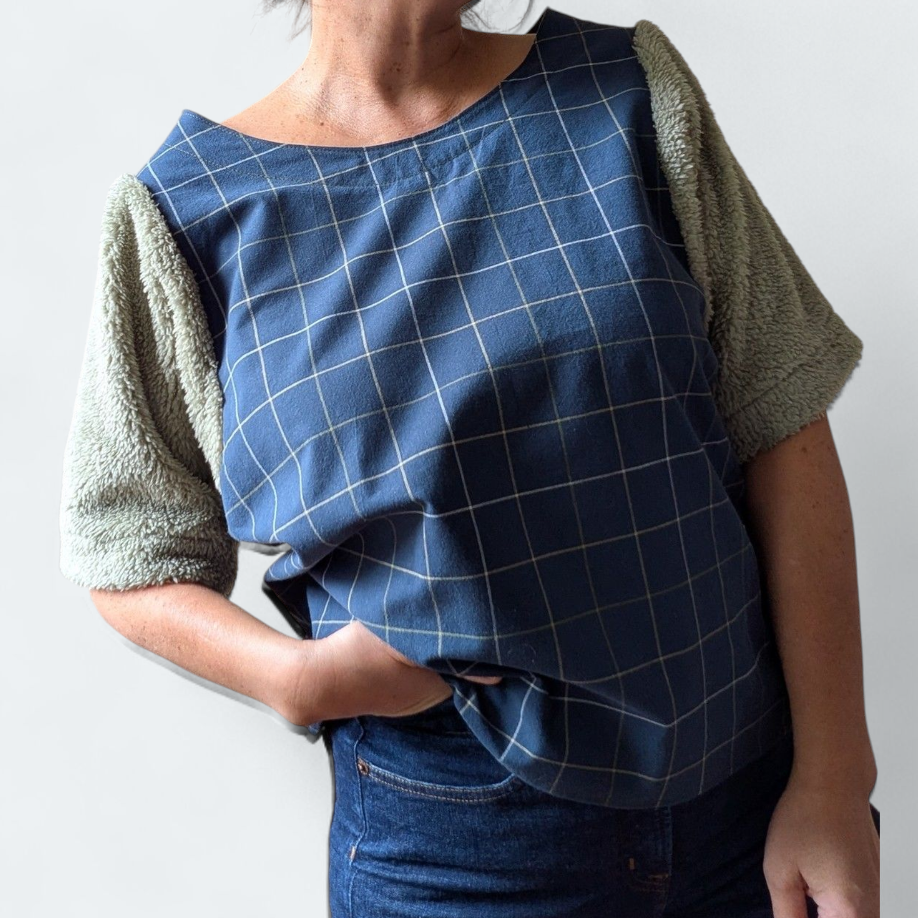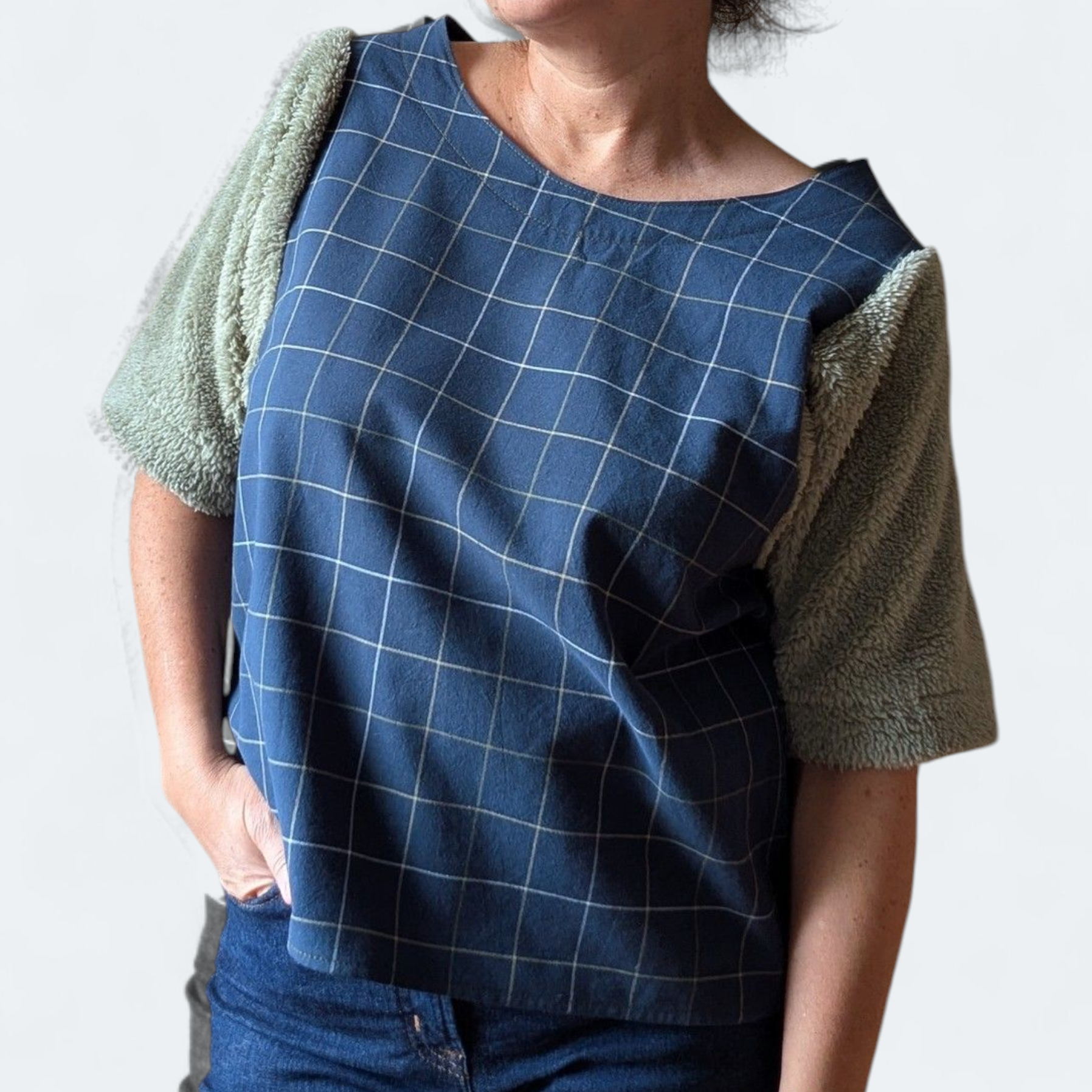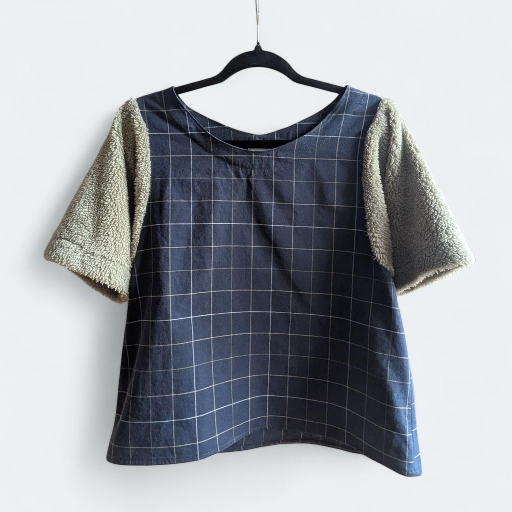 Le corps du vêtement présente un motif à carreaux discret, tandis que les manches courtes contrastent délicatement grâce à un tissu teddy doux et texturé couleur vert, apportant chaleur visuelle et originalité. Chaque détail a été pensé pour créer une pièce singulière, à la fois moderne et intemporelle.
