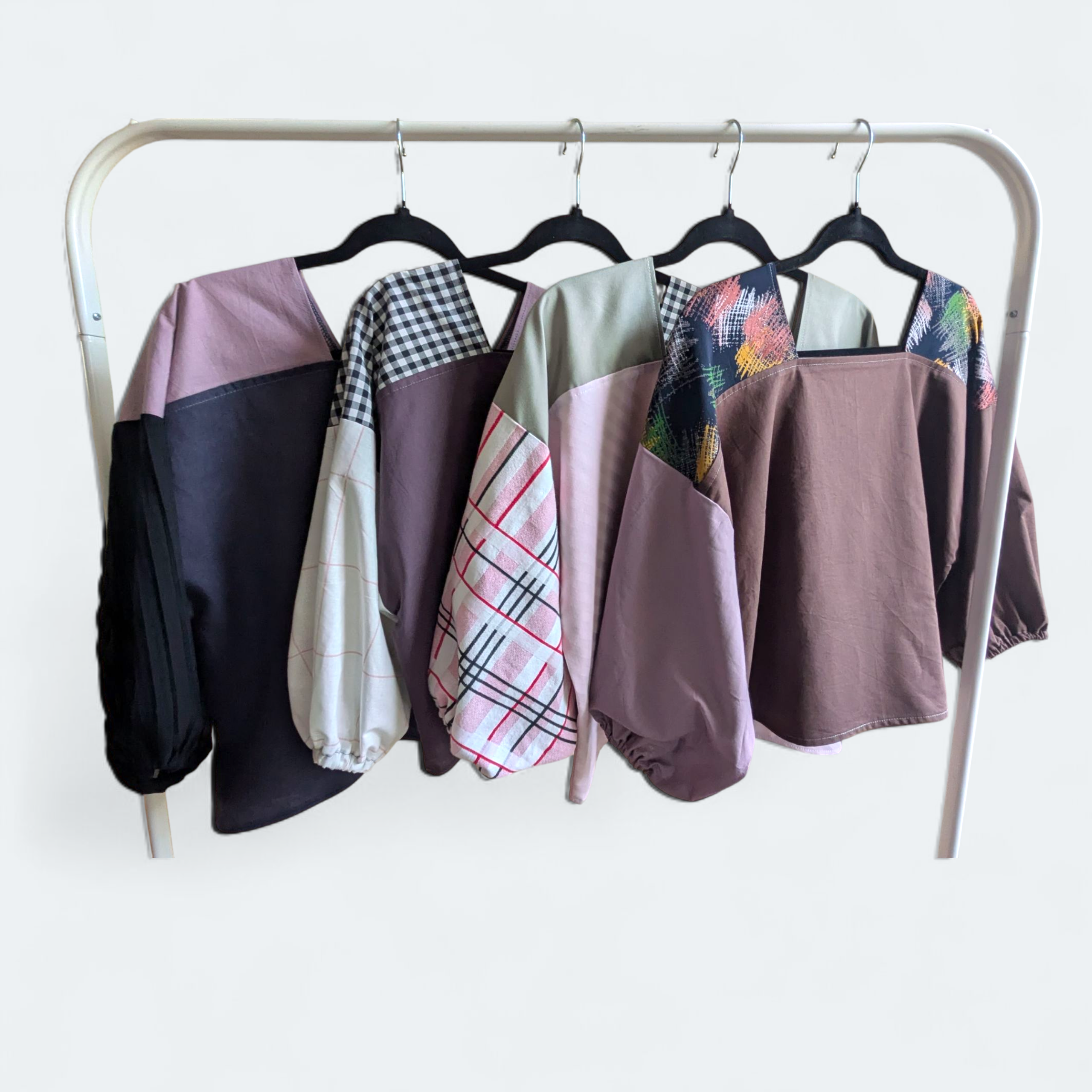Ce haut à coupe ample et col carré a été confectionné à partir de trois tissus récupérés, soigneusement assortis pour créer une pièce unique.