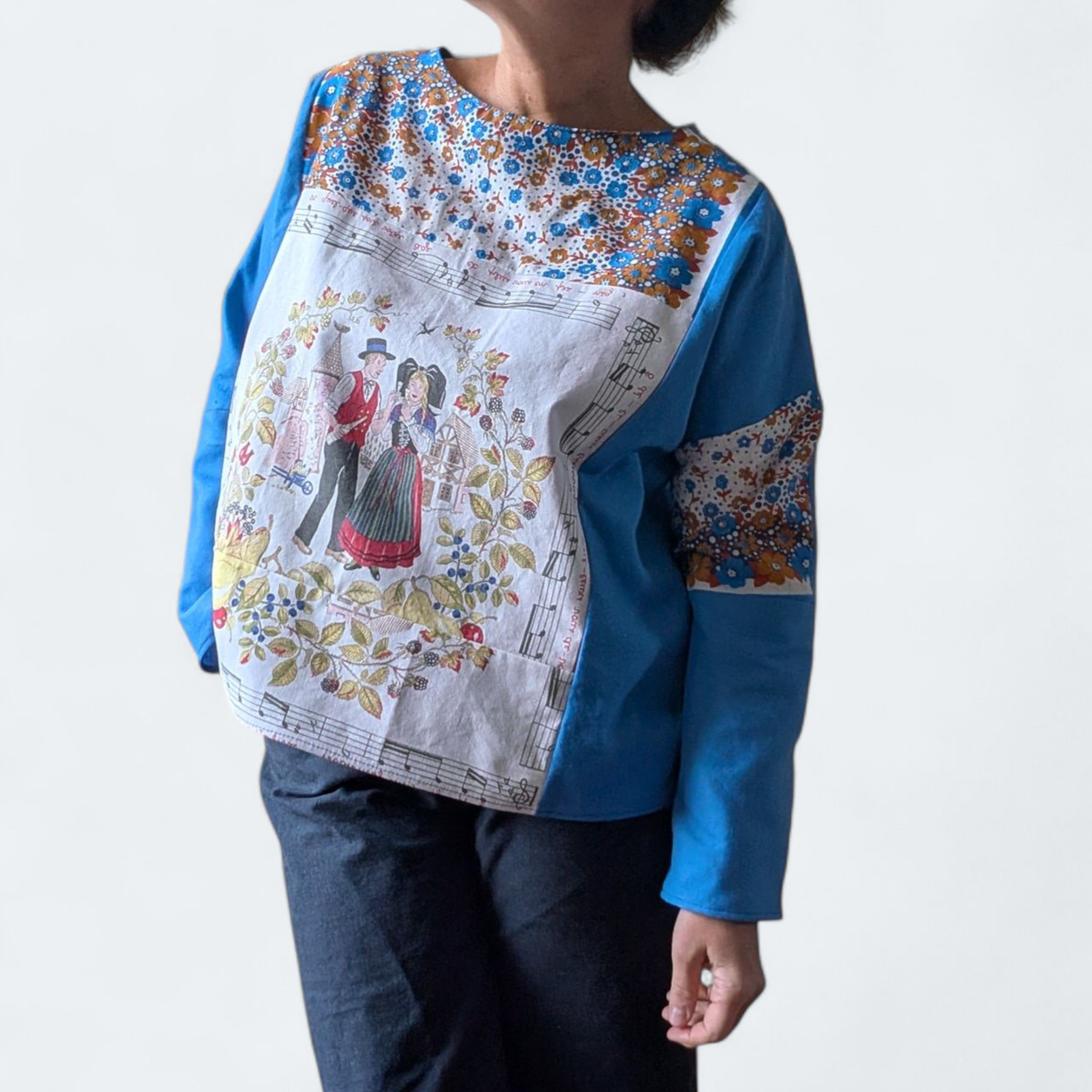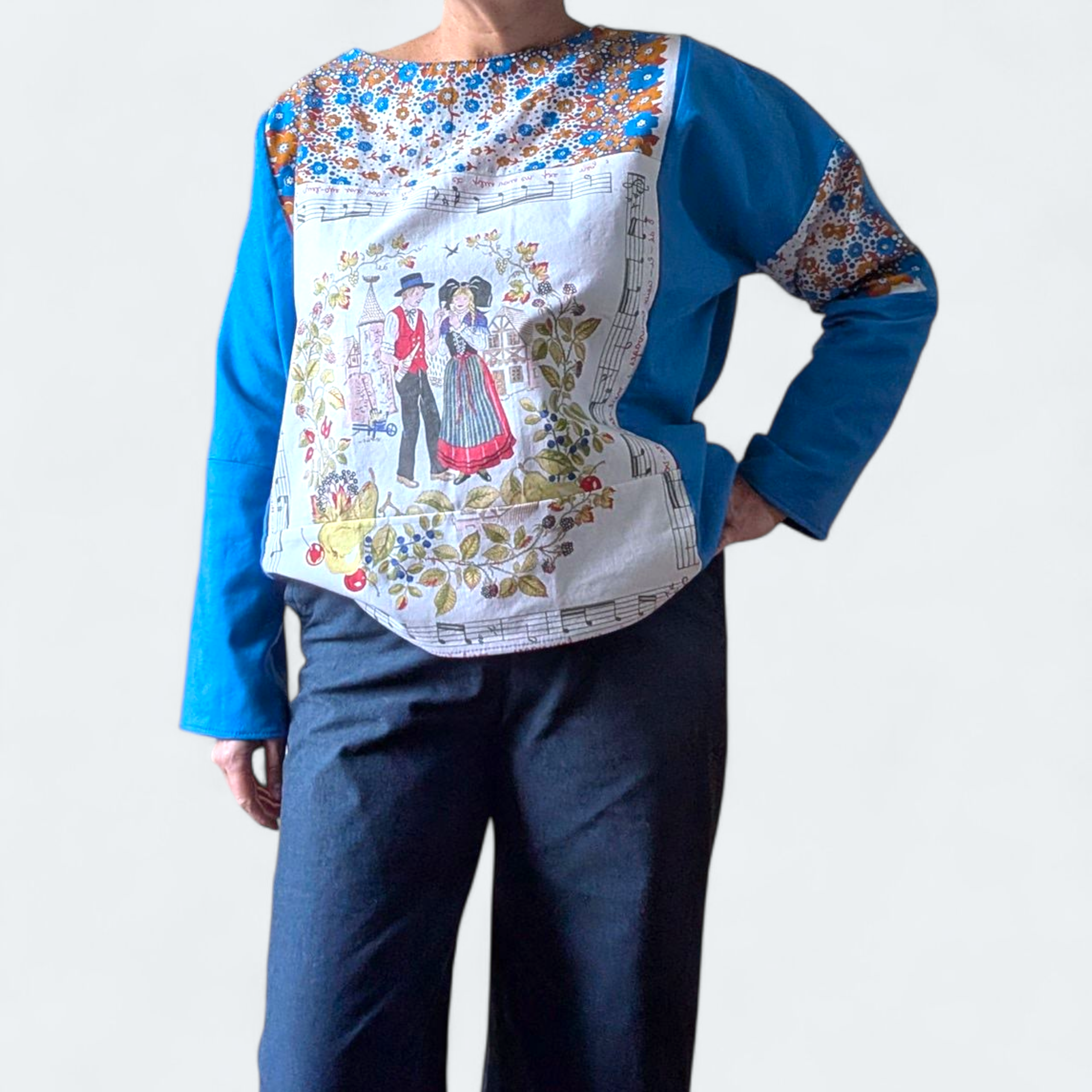 Ce haut oversize est une création singulière réalisée à partir de deux tissus recyclés en coton : un drap bleu et un torchon alsacien. Chaque matière raconte une histoire, donnant à cette pièce un caractère authentique et chargé de sens.
