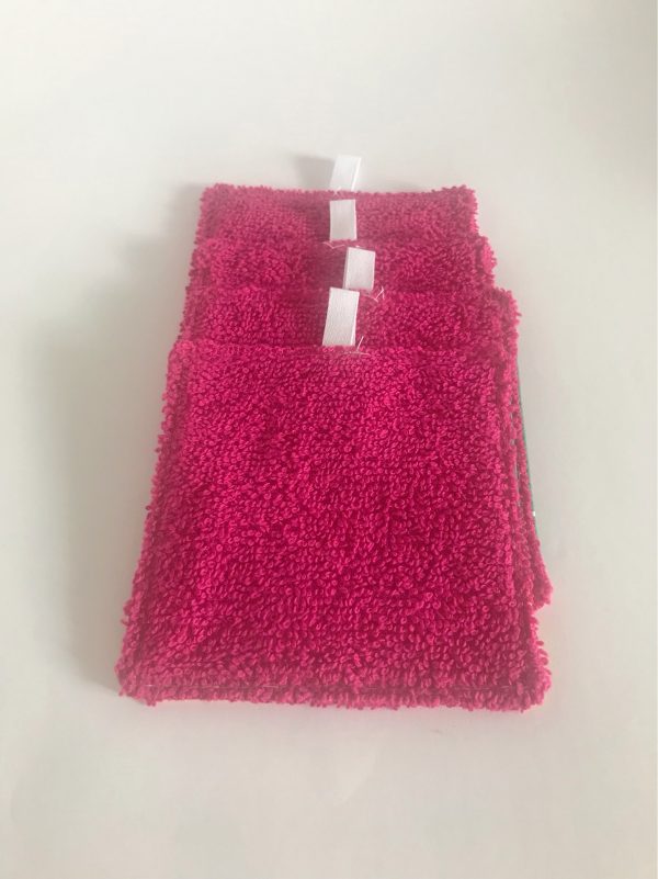 C’est un lot de 4 lingettes démaquillantes et lavables en coton imprimé recyclé , éponge fuchsia oeko-tek